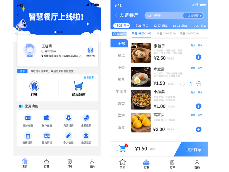 3) 医院病房订餐管理系统从现金管理、营养菜谱编辑、订餐部门各类报表统计、营养分析、备餐管理、送餐管理、餐车管理、扫码支付、无卡充值、微信充值、微信订餐,微信订单查询等都非常明晰.极大的提高了患者订餐的效率和满意度.